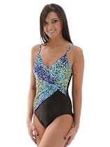 The Miraclesuit Blue Ray Escape swimsuit minimizes your waist with wrap styling. A sweetheart neck helps to accentuate your bust with a foam cup underwire bra. The wavy pattern and metallic accents of this swimsuit draw the eye up to slenderize the hips.