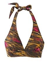 Tie neck, back hook; soft cups. Nylon/Lycra spandex with an artistic diagonal animal and chain print. Hand wash. Imported